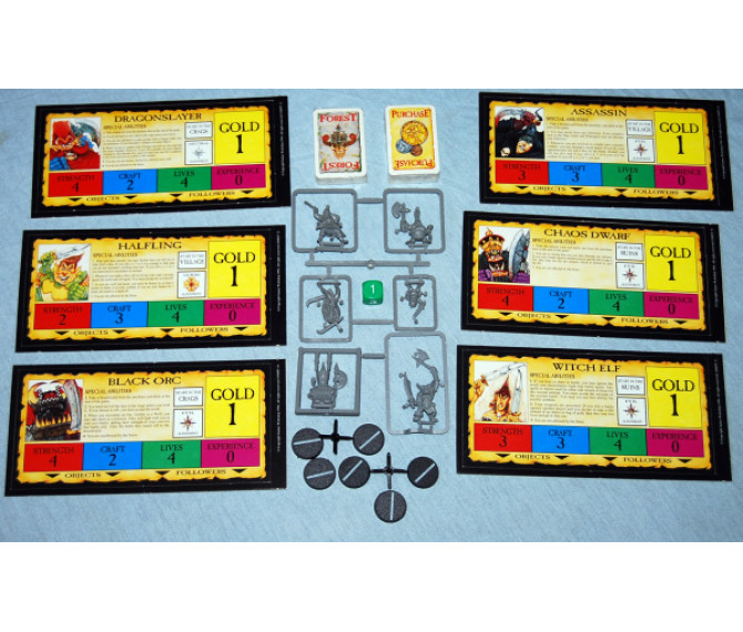 Contains: 1 city section, 1 forest board section, 6 character playing pieces, 6 character cards, 1 rule sheet, 37 city cards, 40 forest cards, 7 purchase cards, 4 adventure cards, 10 special cards, and 1 realm dice.