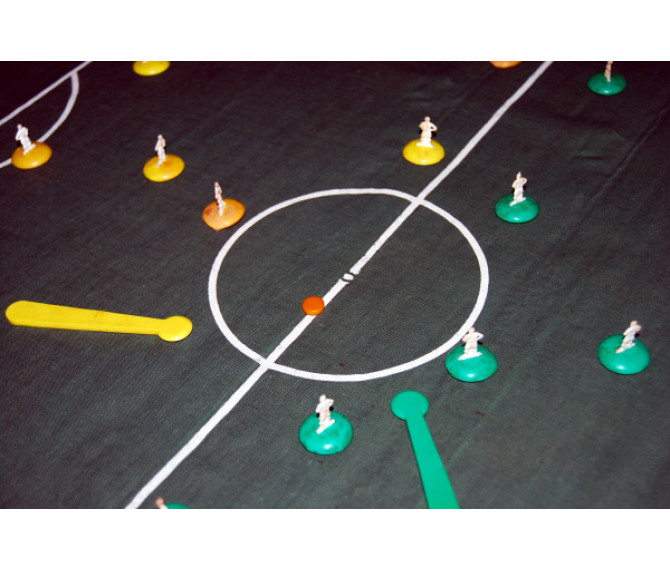 This Game is in some respects related to Subbuteo , The Players move about the pitch and kick the Ball (small plastic disc) by using a small paddle which is used to flick the Player.